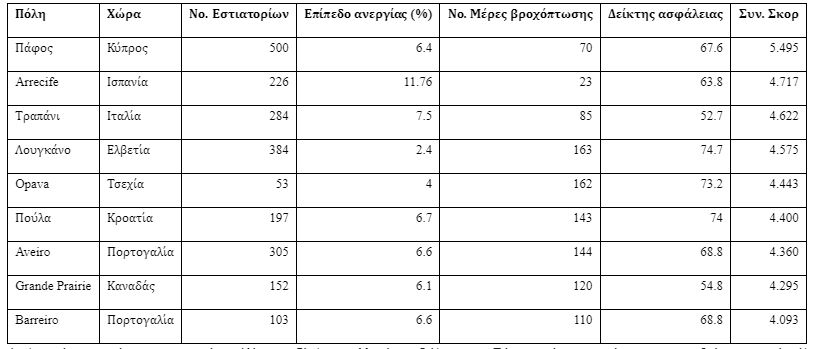 Την πρώτη θέση, με βαθμολογία 5,495 στα 7, κατέλαβε η Πάφος της Κύπρου, με το Arrecife της Ισπανίας (4,717) και το Trapani της Ιταλίας (4,622) να συμπληρώνουν την πρώτη τριάδα. Οι ελληνικές πόλεις που βρέθηκαν στην παγκόσμια κατάταξη είναι τα Ιωάννινα (22η) και η Ξάνθη (44η).