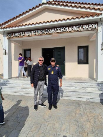 Ο πλοίαρχος Νικόλαος Πετρογιάννης με τον Δήμαρχο Ψαρρών Κώστα Βρατσάνο και τον αρχίατρο Γιώργο Πατρίκιο