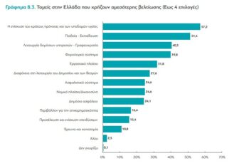 Η υγεία αναδεικνύεται στον πιο κρίσιμο τομέα δυσπιστίας των Ελλήνων της διασποράς απέναντι στους θεσμούς της Ελλάδας. Στα ερωτήματα για τους τομείς που «χρήζουν αμεσότερης βελτίωσης», η υγεία καταλαμβάνει την πρώτη θέση, ξεπερνώντας την παιδεία, τη δημόσια διοίκηση και τη Δικαιοσύνη. Οι ερωτώμενοι θεωρούν ότι η ποιότητα των υπηρεσιών, η πρόσβαση και οι συνθήκες λειτουργίας των νοσοκομείων στην Ελλάδα παραμένουν ανεπαρκείς.