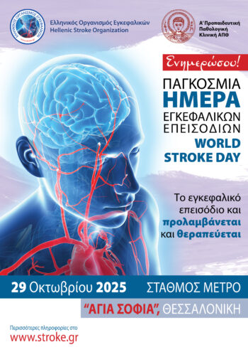 Με αφορμή την Παγκόσμια Ημέρα Εγκεφαλικών Επεισοδίων, ο Ελληνικός Οργανισμός Εγκεφαλικών και η Α’ Προπαιδευτική Παθολογική Κλινική ΑΠΘ συνδιοργανώνουν την Τετάρτη 29 Οκτωβρίου 2025 ενημερωτική δράση στο κέντρο της Θεσσαλονίκης, στη στάση Μετρό Αγίας Σοφίας, από τις 10:00 το πρωί έως τις 14:00 το μεσημέρι.