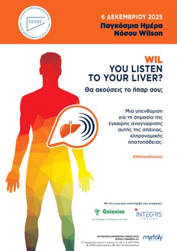 Η Ελληνική Εταιρεία Μελέτης Ήπατος (ΕΕΜΗ) τιμά την Παγκόσμια Ημέρα νόσου Wilson, όπως έχει οριστεί η 6η Δεκεμβρίου 2025, μια ημέρα αφιερωμένη στην ενημέρωση και ευαισθητοποίηση του κοινού για την νόσο Wilson, μία σπάνια κληρονομική γενετική διαταραχή, κληρονομούμενη με τον αυτοσωμικό υπολειπόμενο τρόπο.