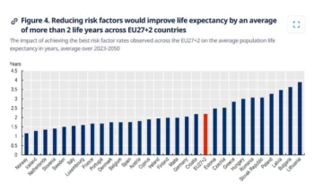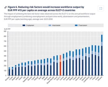 Παράλληλα, με έναν πιο υγιή πληθυσμό, η ευρωπαϊκή αγορά εργασίας θα ενισχυόταν κατά το ισοδύναμο 2,6 εκατομμυρίων εργαζομένων πλήρους απασχόλησης.