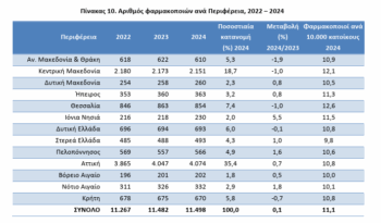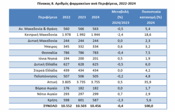 Το 2024 λειτούργησαν 10.456 φαρμακεία σε όλη τη χώρα. Μόνη της η Αττική συγκεντρώνει τα 3.755, δηλαδή 35,9% του συνόλου. Σε εθνικό επίπεδο, ο αριθμός μειώθηκε κατά 0,4% σε σχέση με το 2023. Η μεγαλύτερη αύξηση καταγράφηκε στο Νότιο Αιγαίο (+0,7%), με 2 νέα φαρμακεία, ενώ η μεγαλύτερη μείωση εμφανίστηκε στην Κεντρική Μακεδονία (-2,4%), με 48 λιγότερα.