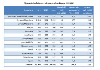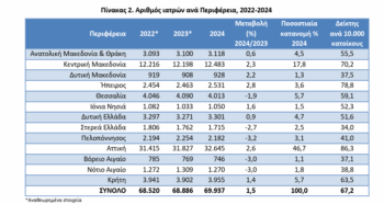 Οι εγγεγραμμένοι ιατροί στους Ιατρικούς Συλλόγους ανήλθαν το 2024 σε 69.937, παρουσιάζοντας αύξηση 1,5% σε σχέση με το 2023. Σε περιφερειακό επίπεδο, τη μεγαλύτερη άνοδο κατέγραψαν η Ήπειρος (+2,8%) και η Αττική (+2,6%), ενώ τις μεγαλύτερες μειώσεις εμφάνισαν η Πελοπόννησος (-3,2%), το Βόρειο Αιγαίο (-3,0%) και το Νότιο Αιγαίο (-3,0%). Η Αττική συγκεντρώνει σχεδόν τους μισούς ιατρούς της χώρας (46,7%) και εμφανίζει την υψηλότερη «πυκνότητα» με 86,3 ιατρούς ανά 10.000 κατοίκους (ο εθνικός δείκτης διαμορφώνεται σε 67,2).