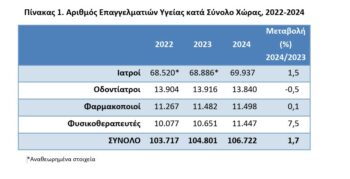 Ανοδική ήταν συνολικά η εικόνα του ανθρώπινου δυναμικού στους βασικούς κλάδους Υγείας το 2024, σύμφωνα με τα νεότερα στοιχεία της ΕΛΣΤΑΤ. Οι εγγεγραμμένοι επαγγελματίες (ιατροί, οδοντίατροι, φαρμακοποιοί και φυσικοθεραπευτές) έφτασαν τους 106.722, από 104.801 το 2023, καταγράφοντας αύξηση 1,7%.