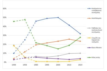 Η ΕΛΣΤΑΤ αποτυπώνει και τη διαχρονική μετατόπιση του «χάρτη» της θνησιμότητας. Το ποσοστό από νοσήματα του κυκλοφορικού στο σύνολο των θανάτων ήταν 10,0% το 1938, ανέβηκε σε 25,0% το 1956 και έφτασε στο 31,9% το 2023.