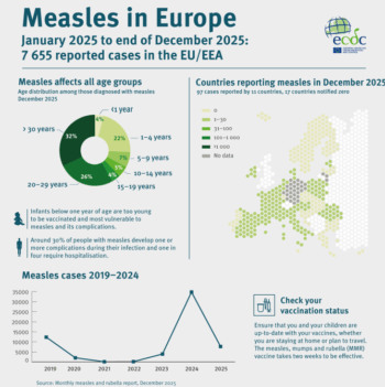 Σημαντική μείωση των δηλωμένων κρουσμάτων ιλαράς καταγράφουν τα προκαταρκτικά στοιχεία για το 2025 στην ΕΕ/ΕΟΧ, σε σύγκριση με το 2024. Παρ’ όλα αυτά, τα κρούσματα παραμένουν σε επίπεδα που προκαλούν ανησυχία, καθώς είναι περίπου διπλάσια σε σχέση με το 2023. Με δεδομένο ότι η ιλαρά εμφανίζει εποχική κορύφωση στα τέλη του χειμώνα και στις αρχές της άνοιξης, το ECDC καλεί πολίτες και υγειονομικές αρχές να δώσουν έμφαση στον έλεγχο της εμβολιαστικής κάλυψης.