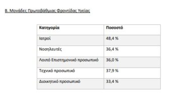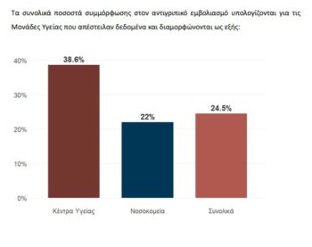 Στην Πρωτοβάθμια Φροντίδα Υγείας (280 Κέντρα Υγείας και ΤΟΜΥ), η εικόνα είναι καλύτερη αλλά και πάλι όχι ικανοποιητική: Aπό τους 12.003 επαγγελματίες υγείας εμβολιάστηκαν οι 4.635, ποσοστό 38,6%.