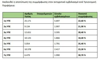 Ιδιαίτερο ενδιαφέρον παρουσιάζουν και τα στοιχεία που αφορούν στις Υγειονομικές Περιφέρειες, με την εικόνα να μην είναι ενιαία σε όλη τη χώρα. Τα ποσοστά συμμόρφωσης διαφοροποιούνται αισθητά μεταξύ τους, αποτυπώνοντας διαφορετικά επίπεδα εμβολιαστικής κουλτούρας αλλά και πιθανές διαφοροποιήσεις στον τρόπο οργάνωσης και παρακολούθησης του εμβολιασμού από τις διοικήσεις.