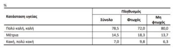 Οι επιπτώσεις της περιορισμένης πρόσβασης σε υπηρεσίες υγείας αποτυπώνονται άμεσα και στη συνολική υγεία του πληθυσμού: Περίπου το 80% των οικονομικά εύρωστων πολιτών δηλώνει ότι βρίσκεται σε καλή ή πολύ καλή κατάσταση υγείας, ενώ το αντίστοιχο ποσοστό στους οικονομικά ασθενέστερους «αγγίζει» το 72%. Παράλληλα, σχεδόν 1 στους 4 Έλληνες αντιμετωπίζει κάποιο χρόνιο πρόβλημα υγείας, με τα ποσοστά να είναι υψηλότερα στους φτωχότερους σε σχέση με τους πιο εύπορους πληθυσμούς.