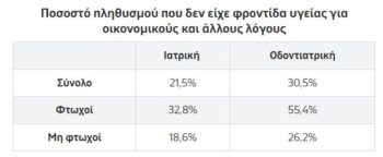 Χαρακτηριστικό είναι το «κενό» στην περίθαλψη που παρατηρείται στις οδοντιατρικές υπηρεσίες. Σύμφωνα με την έκθεση, 3 στους 5 πολίτες αποφεύγουν τον οδοντίατρο, κυρίως λόγω κόστους, στοιχείο που αναδεικνύει ότι ορισμένες υπηρεσίες υγείας εξακολουθούν να θεωρούνται απρόσιτες για μεγάλο μέρος του πληθυσμού.