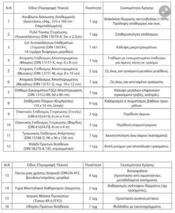 Ανάμεσά τους περιλαμβάνονται κουβέρτα διάσωσης ισοθερμική με συγκεκριμένες διαστάσεις, λευκοπλάστης, τραυμαπλαστ, επιδέσμους, επίθεμα εγκαυμάτων και πληγών, ψαλίδι πρώτων βοηθειών, γάντια μιας χρήσης, υγρά μαντιλάκια καθαρισμού δέρματος, ιατρική μάσκα προσώπου και οδηγίες πρώτων βοηθειών.