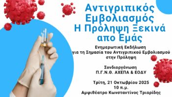 Το Πανεπιστημιακό Γενικό Νοσοκομείο Θεσσαλονίκης ΑΧΕΠΑ, σε συνεργασία με τον Εθνικό Οργανισμό Δημόσιας Υγείας (ΕΟΔΥ), διοργανώνει την Τρίτη 21 Οκτωβρίου 2025 και ώρα 9.30 π.μ. ενημερωτική εκδήλωση με στόχο την ενημέρωση και ευαισθητοποίηση των επαγγελματιών υγείας, σχετικά με τον κρίσιμο ρόλο του εμβολιασμού κατά της εποχικής γρίπης.