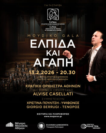 Tο Σωματείο «ΕΛΠΙΔΑ-Σύλλογος Φίλων Παιδιών με καρκίνο», σε συνεργασία με το Μέγαρο Μουσικής Αθηνών και την Κρατική Ορχήστρα Αθηνών, διοργανώνουν ένα μοναδικό Μουσικό Γκαλά «Ελπίδας και Αγάπης» με τον διεθνούς φήμης μαέστρο Alvise Casellati, την Παρασκευή 13 Φεβρουαρίου 2026, στις 20.30, στην Αίθουσα Χρήστος Λαμπράκης του Μεγάρου Μουσικής Αθηνών.